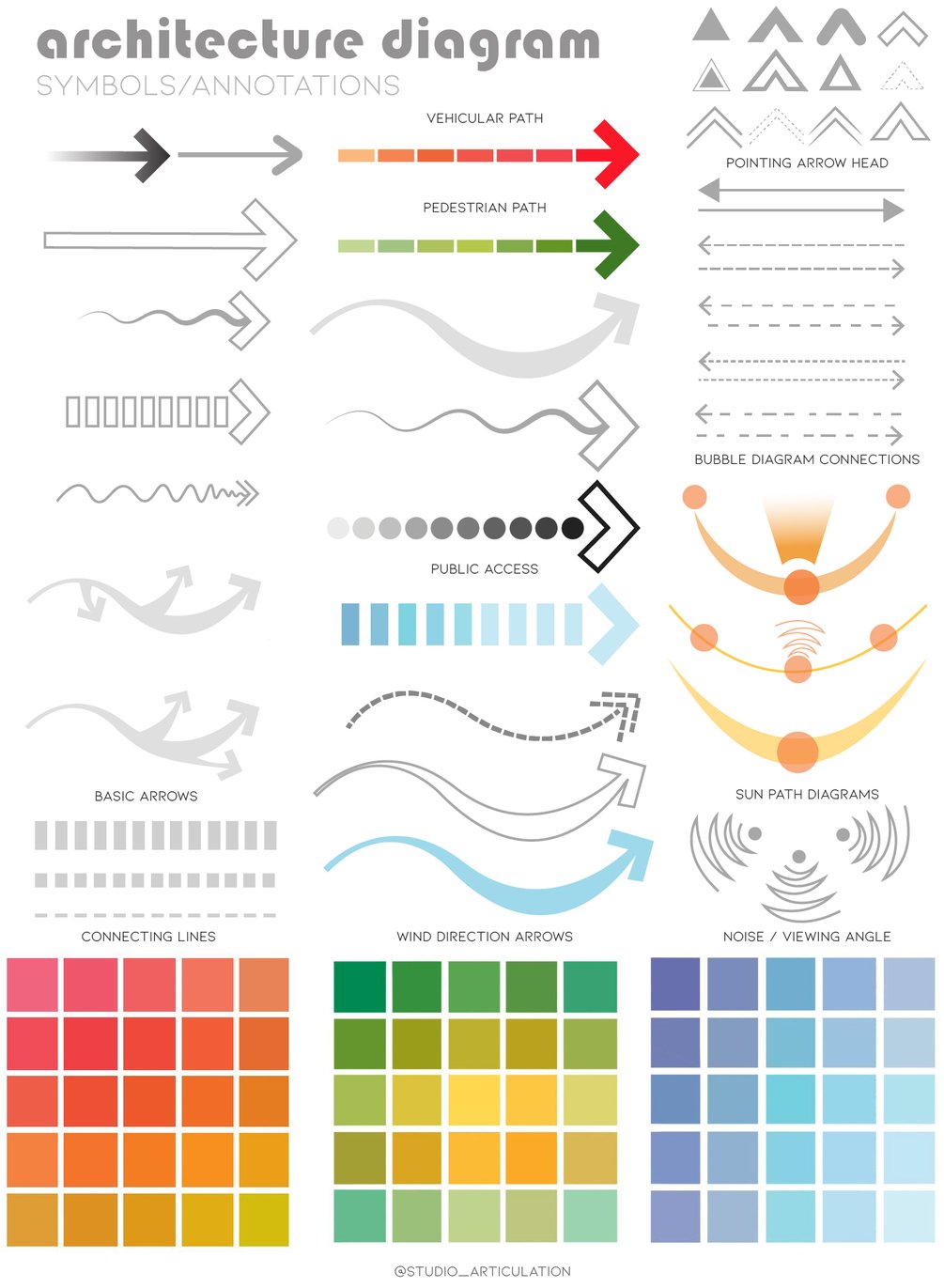 we present you pack of different types of arrows,sunpath diagrams, connecting lines, arrows and colour palettes.